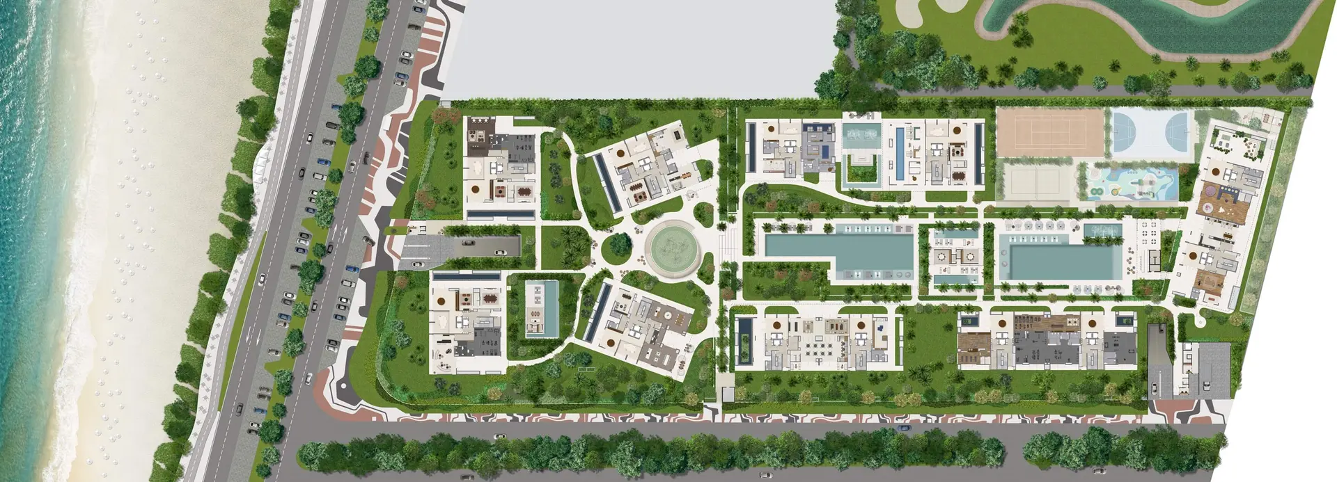 São apenas 132 residências em um terreno de 30 mil m², com mais de 27 mil m² dedicados a lazer e bem-estar, distribuídos em 9 edifícios de arquitetura contemporânea.